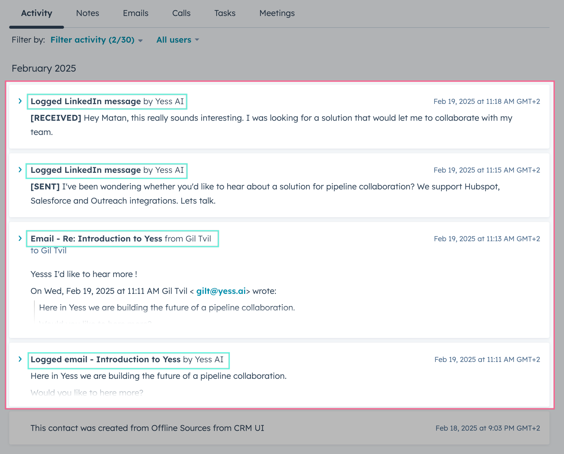 All synced activities will appear in HubSpot with “by Yess AI” as the source, making it easy to track actions taken through our platform.