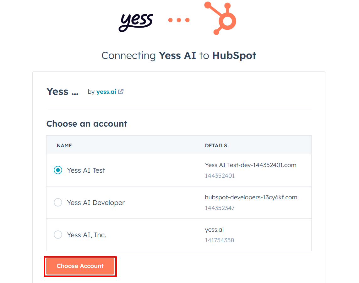 You’ll be redirected to HubSpot to authorize Yess to access your account
