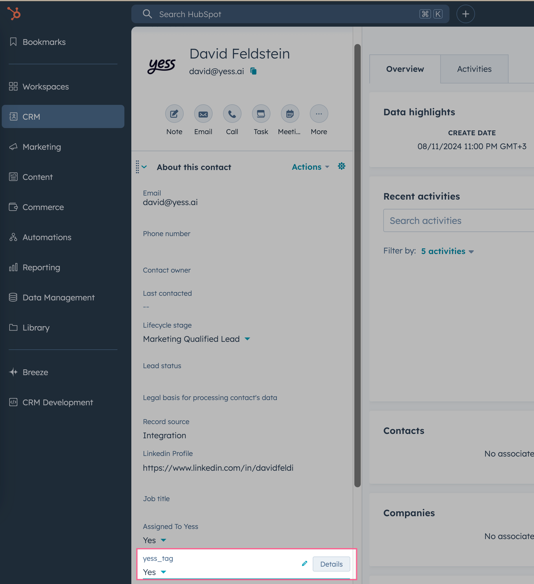 When contacts and companies are synced between Yess and HubSpot, they are automatically linked using email addresses (for contacts) and domain names (for companies). This linking enables:- Automatic activity logging