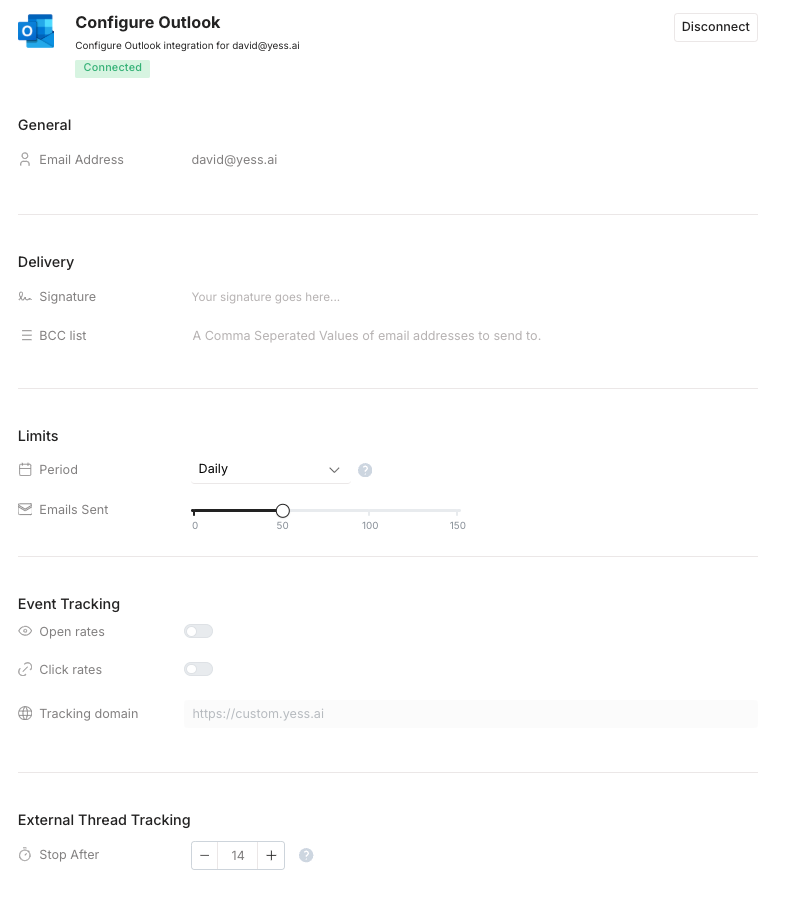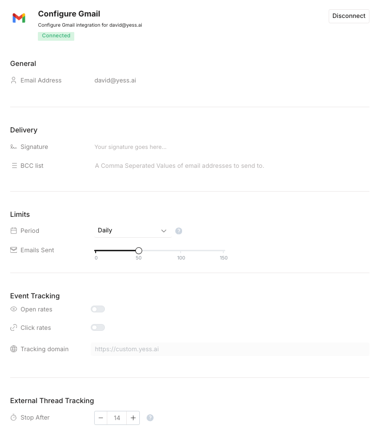Yess integrates with Gmail or Outlook to enable one-off engagements, sequence enrollments, and outbound email campaigns.Gmail Integration
