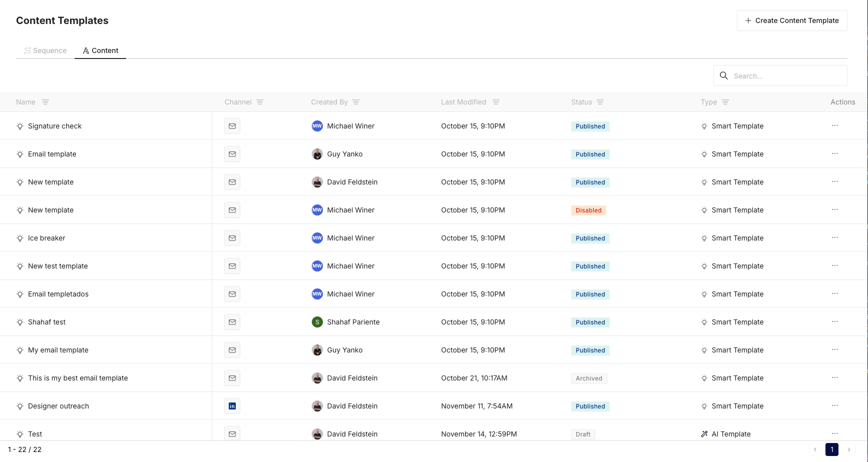 Content templates are reusable message formats for your outreach campaigns. They can be used in both LinkedIn messages and emails (new threads or follow-ups) and can be created manually or generated using AI.